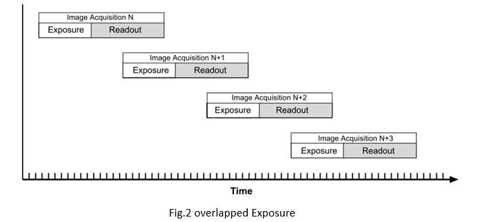虽然非重叠(“non-overlapped”)的模式,可适合于许多情况下,但它并不是最有效的方式。为了提高相机的帧率,允许在下一帧图像开始曝光时候,将前一帧获得的图像数据读出并传送出去。相机“重叠”(“overlapped”)曝光的方式见Fig.2所示。