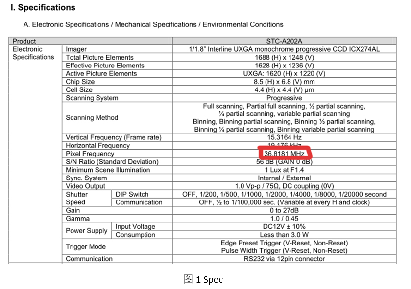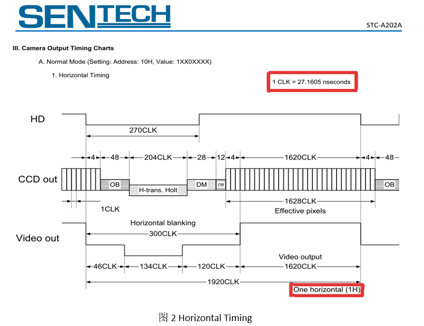 从Spec中可知,其Pixel Frequency为:36.8181MHz,所以1Clock的时间为1/36.8181Mhz =27.3836ns,接下来我们看相机的Timing chart,首先先看HorizontalTiming,见图2所示: