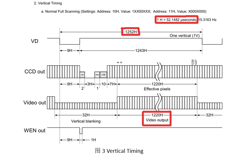 从图3中,我们可读出的信息为,1H=52.1482useconds,和我们通过图2计算出来horizontal Scanning的时间一致,而在一帧图像中,需要扫描1252H,其中Effective Pixels为1220H,即1帧图像中,Effective Pixels Read out的时间为1220*52.1482 =63620.804us =63.620804ms,一个VD信号,所用的时间为:1252*52.1482=67793.5464us =67.7935464ms。按照我们前边的理论,一个cycletime内,一帧图像的时间为:Frame Period = Exposure Time +Readout Time