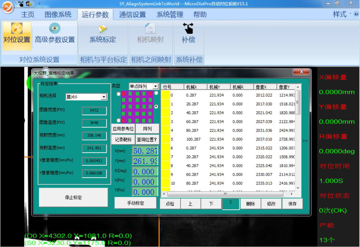 系统采用宫格标定,自定义行列数和间距及旋转角度,通过机械手发送的当前机械坐标,视觉软件自动计算出宫格机械坐标,视觉软件与机械手进行网口通讯,机械手吸取物料到达指定的机械坐标,相机拍摄物料计算出像素坐标和机械坐标的关系。