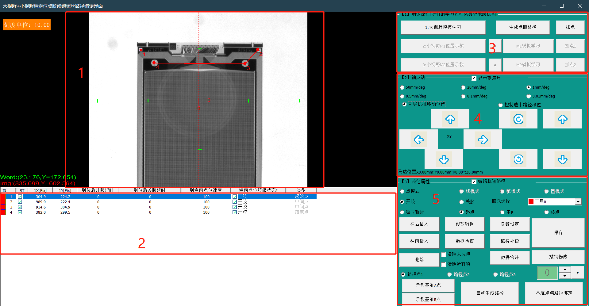 MasterAlign全景视觉点胶应用软件提供一种全景视觉引导点胶的智能合机器视觉图像处理方法,提供建模工具,快速提取图像中的待处理物件边缘点像素坐标信息。并结合视觉与点胶运动执行结构的标定,转换为机械坐标信息,从而实现快速的产品换型,引导执行机构进行加工点胶等,大大提高的生产效能。