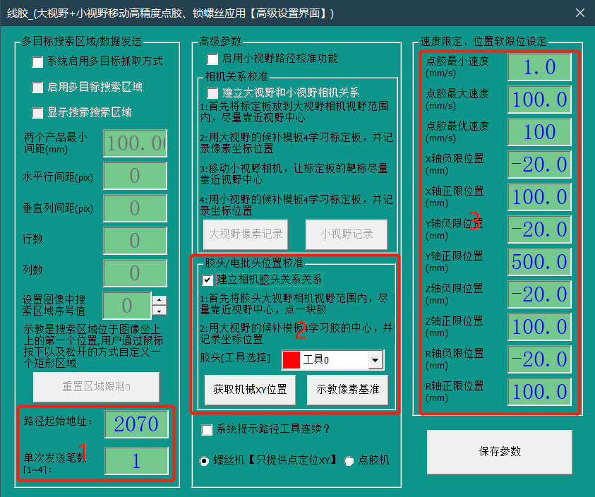 3:速度、限位设定:设置点胶速度、点胶相关轴的软极限