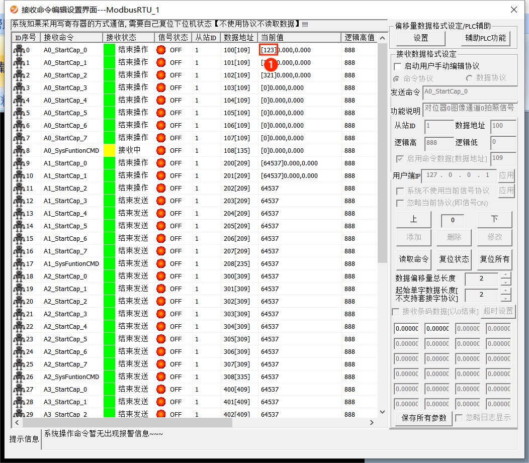 ①是PLC发送过来,视觉接收到的数据,点击②之后才能进行编辑右边的数据,要保证③IP地址和PLC的地址一样,修改后点击下面“保存所有参数”保存,然后点击②才可以退出