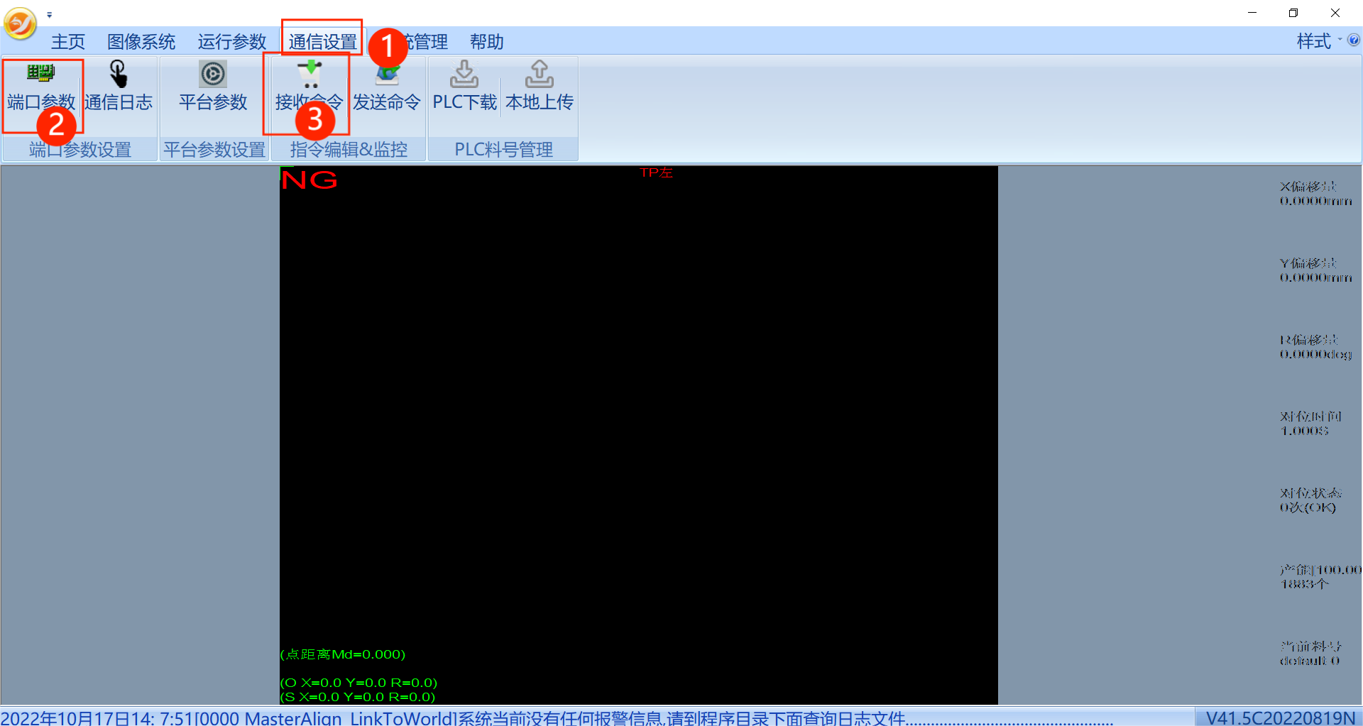 点击图像中①进入到通讯设置界面,点击②③,分别打开通讯日志和端口参数界面