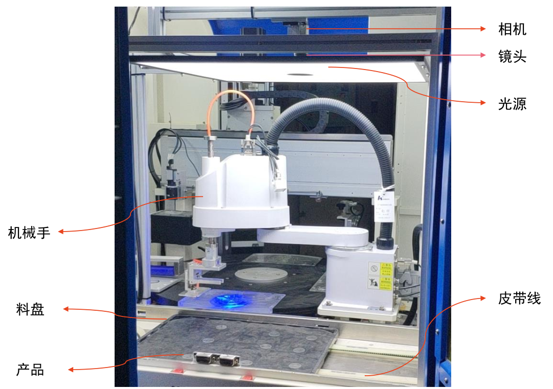 视觉定位系统采用打正向光方式,光源在机械手上方,CCD从上往下拍摄,进行图像分析定位。相机将计算出的像素坐标转换为机械手的物理坐标,视觉软件与机械手进行网口通讯,将视野内物料的物理坐标发送给机械手,机械手抓取物料放在指定工位。