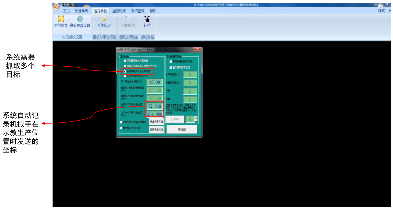 系统采用宫格标定,自定义行列数和间距及旋转角度,通过机械手发送的当前机械坐标,视觉软件自动计算出宫格机械坐标,视觉软件与机械手进行网口通讯,机械手吸取物料到达指定的机械坐标,相机拍摄物料计算出像素坐标和机械坐标的关系。