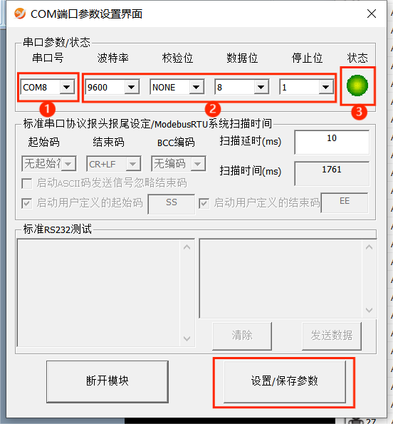 ①是串口号,要与PLC串口对上,②的设置要与PLC端口一致,③仅是代表端口是否打开,即使亮绿灯也不代表和PLC连接正常,修改①和②后要点击右下角“设置/保存参数”保存参数