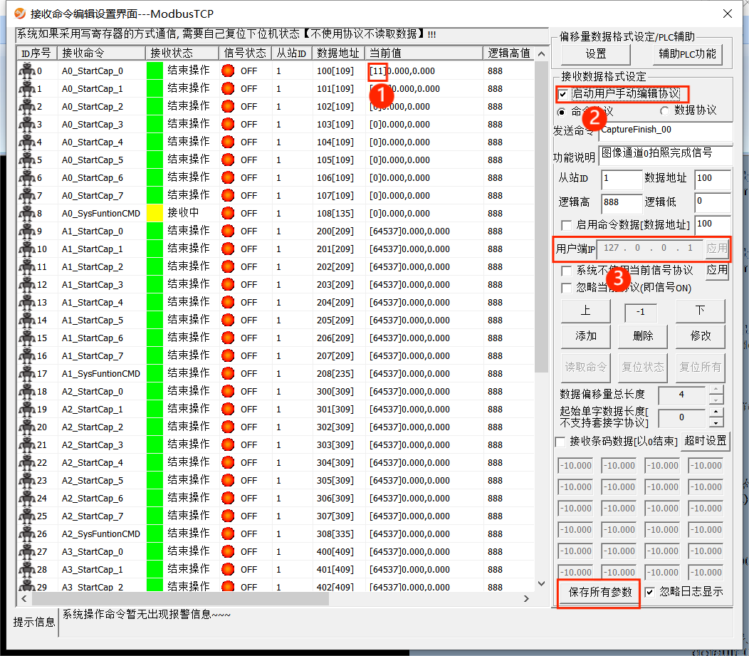 ①是PLC发送过来,视觉接收到的数据,点击②之后才能进行编辑右边的数据,要保证③IP地址和PLC的地址一样,修改后点击下面“保存所有参数”保存,然后点击②才可以退出