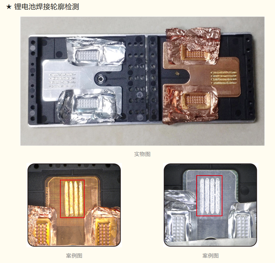 案例图常规的锂电池焊接检测,多采用2D成像分析,可使用组合光源进行检测。