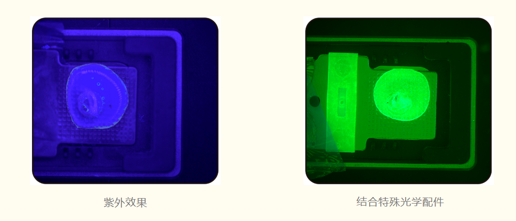 胶水检测也多采用2D面阵成像,但胶水表面是透明无色光滑的,使用常规光源方案不一定有好的效果;这时我们可以使用紫外光源,使胶水轮廓突出。