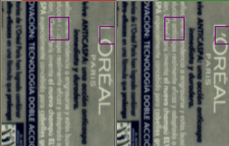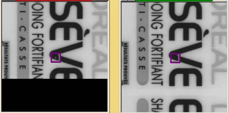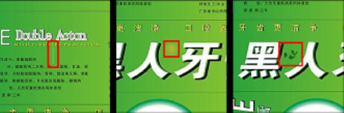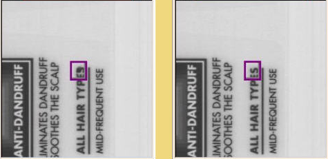 根据当前检测图像与模板进行逐点灰度值比较,找出大于大模板图像灰度值(漏印或墨浅)点然后进行加权计算,生成漏印图像;找出小于小模板图像灰度值(脏点或墨浓等)的点进行加权计算,生成脏点图像。错误值根据Tolerance(容忍度)、STEP(步长参数)、GAIN(增益参数)、LIMIT(范围参数)进行计算。通常情况下,由于产品中的字符区域带有很多重要信息,因此对于字符区域缺陷的检测往往要比其它区域更加严格。典型的字符缺陷包括:漏印、脏点、针孔,分别如下图所示。