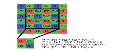 SPI通讯模块Spi_fast_com完成对CMOS的初始化配置,选用了4000×3000矩阵的输出模式,输出10位的LVDS数据。通过Sensor_deser传感器数据采集模块,实现数据流的串行移位解码[3],产生同步控制信号和8路的10bit数据流,数据采集部分包括了LVDS解码、解串训练、同步发生、通道变换等逻辑设计。数据转换中,Binning变换主要实现对传感器数据的均值处理和分辨率调整,图2为Binning算法的基本原理示意。