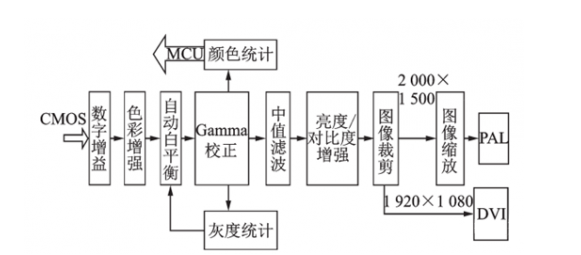 (2)图像处理逻辑设计。图像处理逻辑设计主要完成对采集后数据的图像处理,涉及的图像处理算法包括:数字增益、色彩增强、自动白平衡、Gamma校正、颜色/灰度统计、中值滤波、亮度/对比度增强、图像裁剪、图像缩放。图3为图像处理逻辑设计流程框图。
