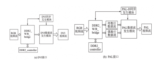 DVI的同步发生模块控制数据流的同步时序,从DDR2缓存区中读取相应区域的数据,数据流发生模块接收数据后,同步生成DE、HS、VS等同步信号,产生标准的DVI视频流。经DVI编码电路编码后,产生标准DVI输出。对于模拟PAL接口,需对逐行的RGB数据进行转换,按PAL制式输出视频流。采用DDR2缓存(P2I转换)+PAL数据处理的纯逻辑方案,实现输出数据流的重构。逻辑设计主要包括多端口DDR2读写桥接设计和PAL驱动控制设计。基本设计框图如图4(b)。相比数字视频输出显示的DDR2操作,PAL制式输出视频流在DDR2读出操作上有所差别。