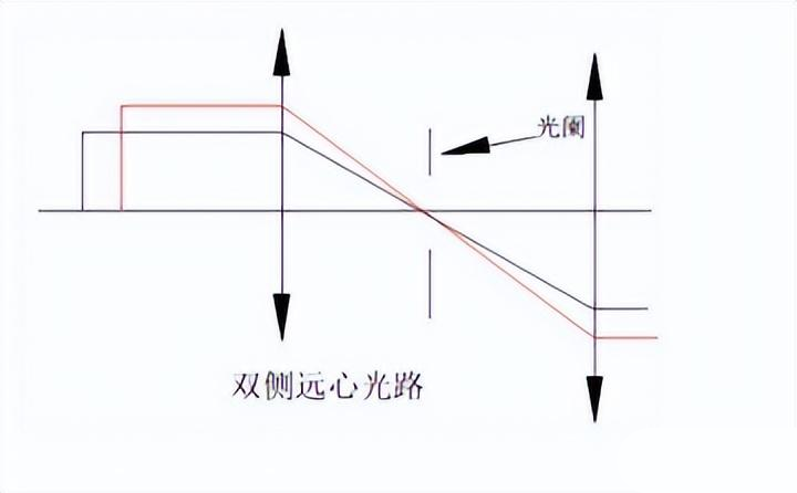 双侧远心光路就是我们常说的双远心光路,光路图如下图。它综合了像方远心和物方远心的双重优点,在景深范围内,物体离得远近或者相机离得远近,都不会影响到成像系统的放大倍数,即像不随物距和相距的变化而变化。根据双侧远心光路设计出来的镜头为双远心镜头。