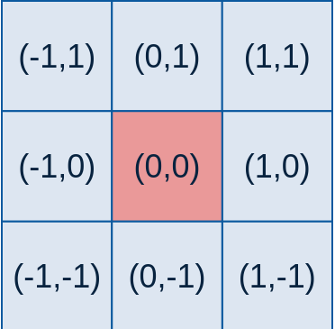 的高斯滤波器模板,以模板的中心位置为坐标原点进行取样。模板在各个位置的坐标,如下所示(x轴水平向右,y轴竖直向下)