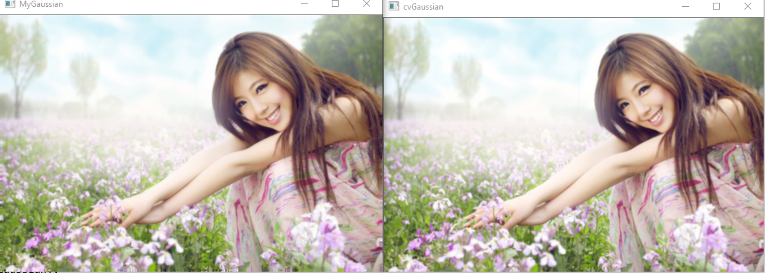 下图是自己实现的高斯滤波器和OpenCV中的GaussianBlur的结果对比