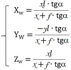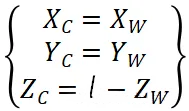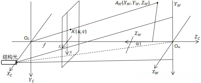如上图所示,图中显示了3个坐标系,分别为相机坐标系OCXCYC、图像坐标系oxy和世界坐标系OwXwYw。图像坐标系与相机坐标系原点之间的距离为焦距f,图像坐标系与世界坐标系原点之间的距离为l。结构光平面与相机光轴夹角为a,取世界坐标系的原点位于相机光轴与结构光平面的交点,Xw轴和Yw轴分别与相机坐标系XC和YC轴平行,ZW与ZC轴重合,但方向相反,则世界坐标系与相机坐标系有如下关系: