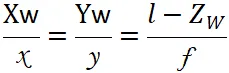 设世界坐标系中的一点A的像为A’,则根据相似三角形原理,有: