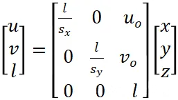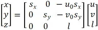 又由于在像素坐标系ouv中,每一像素的坐标(u,v)分别是该像素在图像矩阵中的行数与列数,(u,v)是像点在像素坐标系中以像素为单位的坐标。根据像点在像平面上的物理位置,建立以物理单位表示的图像平面二维坐标系oxy,该坐标系x轴和y轴分别与u轴和v轴平行,原点为相机光轴与像平面的交点,一般位于图像中心,但在实际情况下会有小的偏移,在ouv中的坐标记为(u0,v0),也称为主点坐标。图像中任意一个像素在两个坐标系下的坐标采用齐次坐标和矩阵式表示,有如下关系: