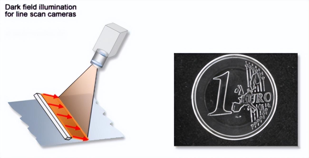 线扫描相机也可以用于实现暗场效果。为此,照明不会以反射角度对准组件,而是明显更平整。直接反射的光不会入射到相机上,因此像场显得很暗,因此相机只能检测到微弱的杂散光。该技术需要大量的光。刮痕、缝隙、高程或浮雕由于其表面不平整而在散射光时显得明亮。是检测光滑材料表面缺陷的理想方法。
