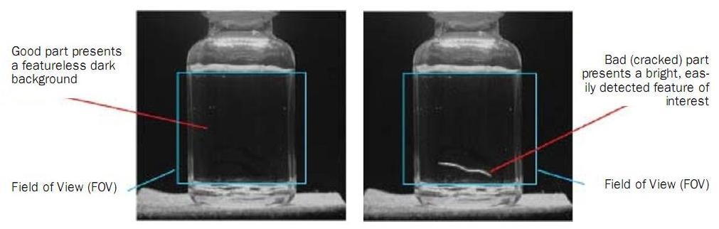 在这个应用当中,用暗场照明来创立一个明亮的,在暗背景下容易检测的感兴趣特征。在一个暗场区域中光线直接通过透明的瓶子。大多数穿透透明对象的光线不会被相机检测到。如果材料不规则,比如有裂纹,一些光线就会凸显出这个不规则。特别是划痕创立了一个内部空缺,这里光线折射和反射,以许多角度散射包括返回给相机。这些光线将很难检测的划痕转换到暗背景下的亮特征。