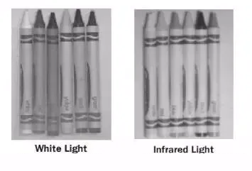 红外光能用于在彩色对象之间消除灰度差别。暗对象吸收红外波长,创造出一致性,而其它则呈现阴影。这个照明方案有利于检测颜色或阴影变化的非一致性。