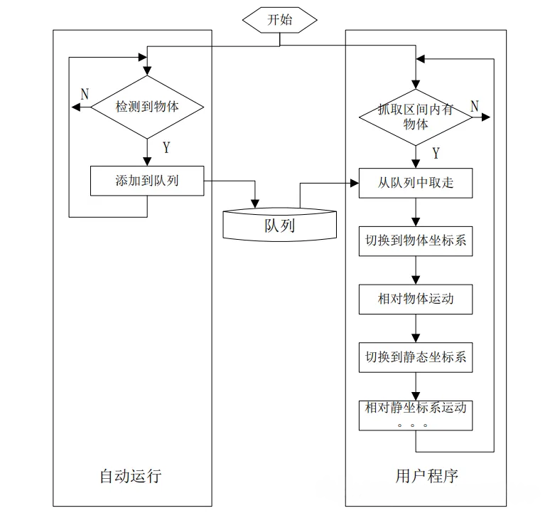 跟随工艺工作过程主要分两部分:检测和跟随运动。检测是通过视觉或光电传感器获得物体在传送带上的位置,将获得的物体位置信息放入传送带对象队列中,并通过编码器反馈跟踪其位置的变化;跟随运动是以队列中移动物体为参考坐标系的机器人运动。检测与跟随运动并行处理,具体流程如下图所示。