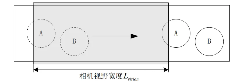 5、重复检测判定距离:按上述拍照间距设置原则,前后两次拍照画面有重叠,这有可能导致同一个物体在前后两次拍照中同时被识别,造成重复,此时需要剔除其中一个。控制器内部会对前后两次拍照物体的位置进行比较,如果两个物体的距离小于重复检测判定距离,认为是重复,剔除后一次拍照得到的物体。重复检测判定距离的设置原则是正确识别重叠的同一物体和正常靠近的两个物体。如下图所示,当两个物体距离大于2Rmin时可认为是两个物体,否则认为是同一个物体,因此重复剔除距离按如下原则设置: