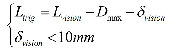 视觉必须在一个拍照周期内完成图像识别,拍照周期=拍照间距/传送带速度,拍照间距设置过小会导致拍照周期变短,要求视觉的处理速度更快,因此在满足不漏拍的前提下拍照间距尽量大。综合各方面需求,拍照间距不能太大也不能太小,可按下列公式给定,其中Ltrig为拍照间距,Lvision为视野宽度,Dmax为物体识别标识最大宽度, 为设置余量。