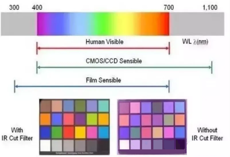 摄像头镜头组件由一个很重要的构件,就是滤波片;IR cut filter,即红外截止滤光片,它放在于LENS与Sensor之间。因人眼与CMOS Sensor对各波长的响应不同,人眼看不到红外光但sensor会感应,因此需要IR cut filter阻绝红外光。