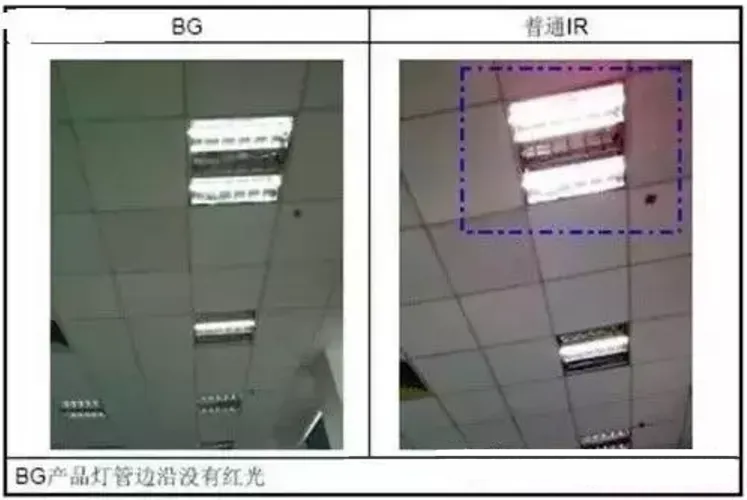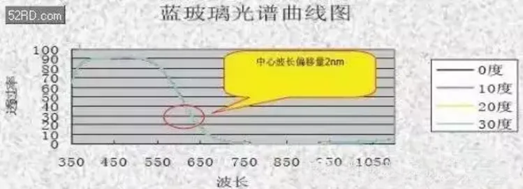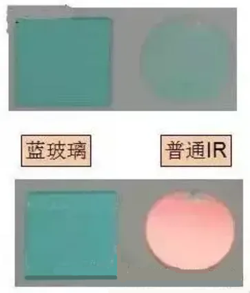 普通IR中心波长偏移量在入射角0°~30°,偏移30nm左右,会形成色彩不均匀现象;蓝玻璃IR中心波长偏移量在入射角0°~30°,偏移2nm左右,不会出现黑角及红斑现象。