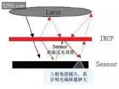 普通IR采用反射式,在可见光区域有较高透过率的同时,存在较低的反射率,而在红外区域正好相反,反射较高。所以,当相机在成角度拍摄照片时红外光在IR膜上会有较大反射,经过光线多次反射后,会在照片上形成光晕现象。