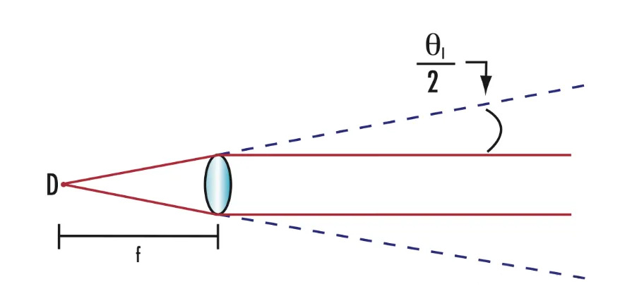当光源的光线相互平行传播时,就会发生准直光。这是通过使用光学器件来操纵发散光束,或者通过将发散源放置在离物体足够远的地方,使其在到达物体时看起来是准直的来实现的。通过将发散源定位在正透镜的焦点处,光线在经历折射后将准直。光源和所用特定透镜的尺寸将决定所得光束的准直程度。方程1显示了准直光束中剩余发散度θ、光源直径D和准直透镜焦距f之间的关系。该方程不考虑可能影响准直光束质量的其他方面,例如透镜的形状因子、图形误差或折射表面的粗糙度。方程1显示了在合成发散和光收集之间经常需要的折衷。图1概述了一个简单的准直装置,并演示了准直光束的端径如何与所用准直透镜的端径相等。