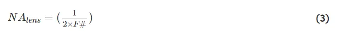 成像透镜的数值孔径可以作为制造规范的一部分包括在内,但也可以使用其F数的倒数来估计(如方程3所示)。由于两者直接相关,NA也可用于定义成像透镜的分辨率和景深。