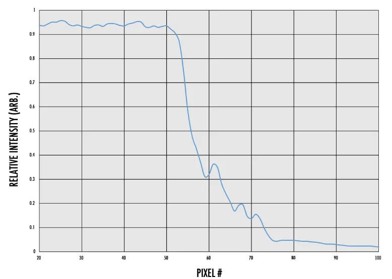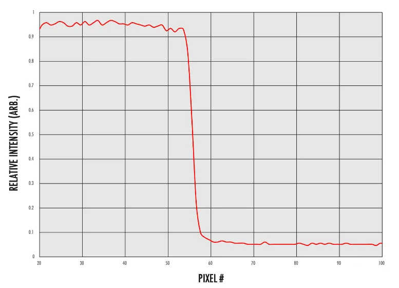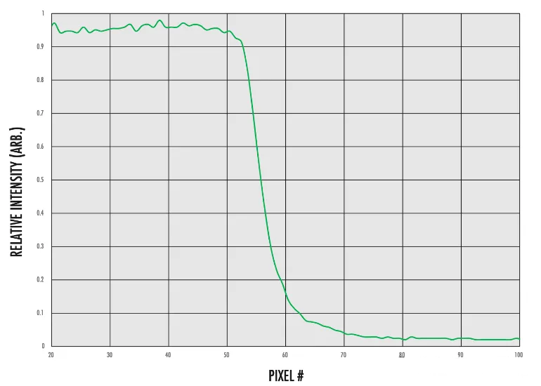 当查看边的强度轮廓时,会确认干净边的外观。图11显示了从亮到暗的过渡过程中更陡的斜率,发生在大约20个像素上,并且没有像图6中那样受到噪声的影响。
