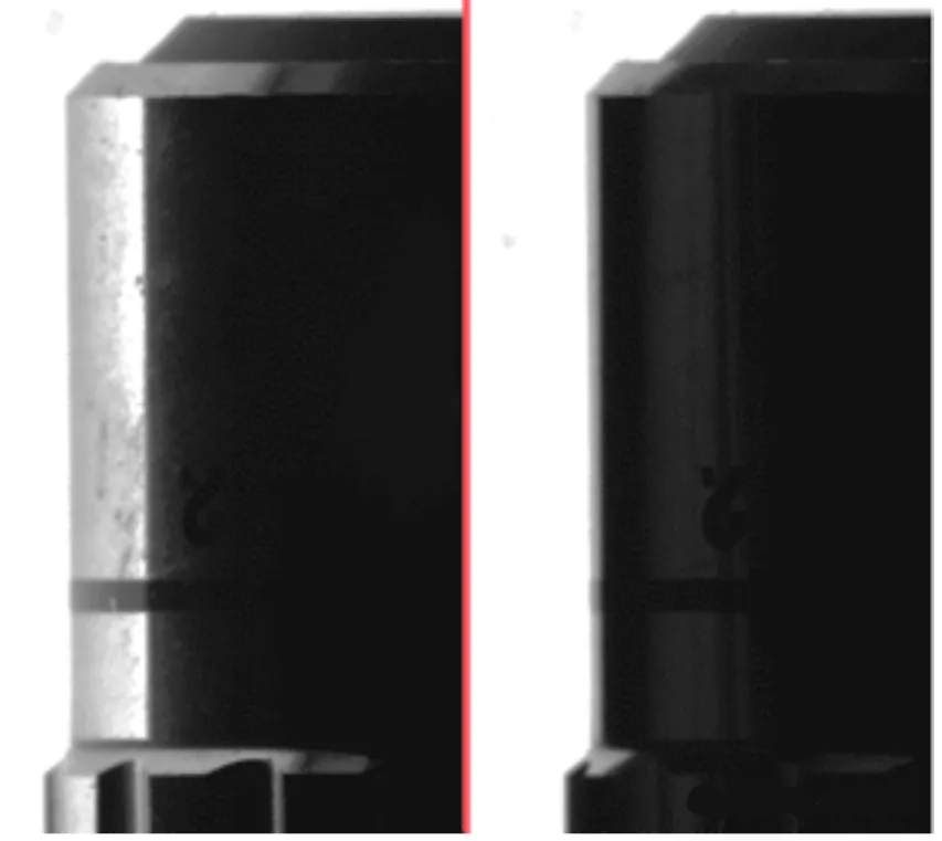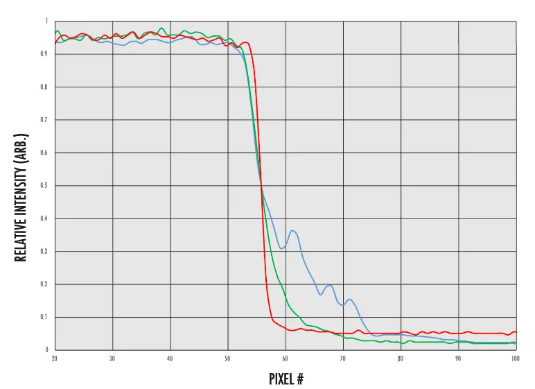 这种散射会表现为边缘出现梯度和模糊,这可能会使用户或软件很难分辨出物体的边缘在哪里。大量散射也可能照亮物体的不必要部分,并导致获取误导性数据。图6所示的边缘轮廓具有从亮到暗(从高到低)的相对强度,范围约为30个像素,物镜侧面的文字会在数据中产生波纹。