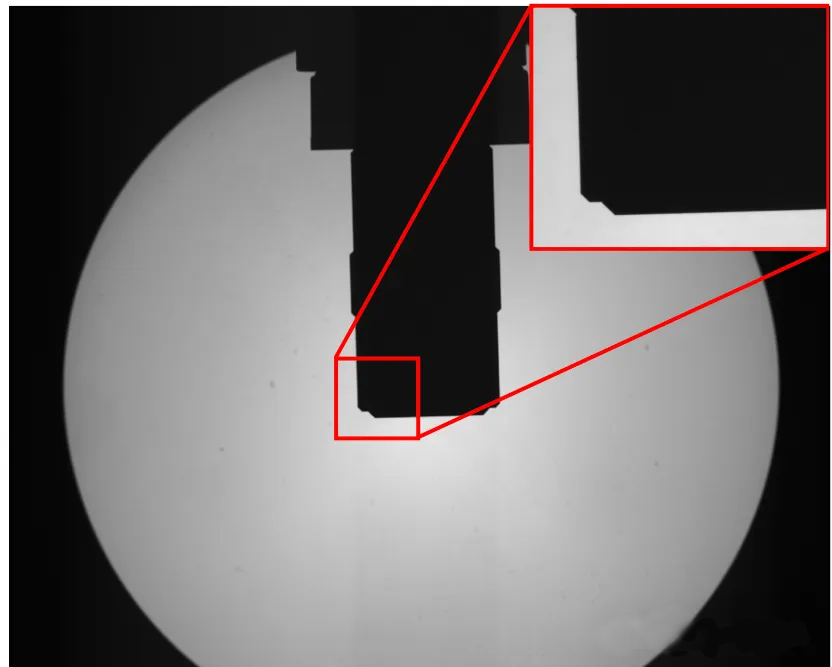 远心照明器的主要优点是通过其光学设计实现的高度准直。发散LED光源集成到组件中,产生准直光线,通常在不到一度的真实准直范围内。这些类型的远心照明器是通过精确定位一个大的正透镜和一个小而强大的LED来构建的,从而创建一个照明轮廓,该轮廓可以创建清晰的轮廓,并比其他背光方法更好地匹配远心成像透镜的NA。图13显示了由远心照明器背光的图10中的同一物体。该物体没有表现出从传统背光中看到的边缘散射效应,并且与准直背光相比具有更尖锐的边缘过渡。图14证实了这种急剧的转变,从亮到暗的斜率发生在不到10个像素的范围内。