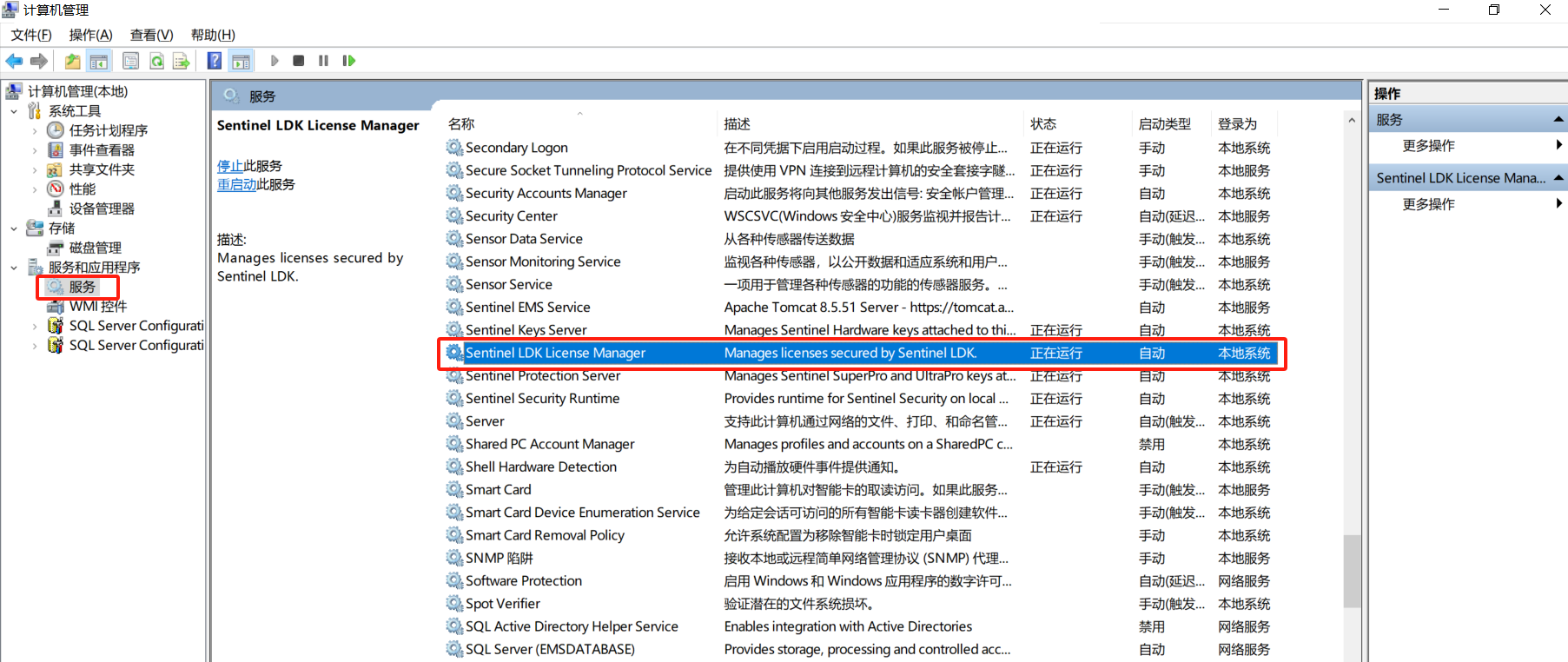 4、检查”服务”中Sentinel LDK License Manage是否出现关闭的情况
