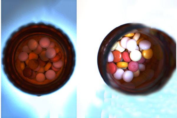 对于瓶装的药品,通常分玻璃瓶和塑料瓶。对于玻璃瓶,通常分为有色和无色的,无色的检测起来会比较简单,可以通过侧面去做检测,难度并不大。而对于有色玻璃瓶来说,因为玻璃本身的颜色影响,我们不论从侧面还是正面都很难对药丸采集到好的图像,要分辨出药丸的颜色就会有一定的难度,当然,我们也有解决的办法,那就是通过一定角度的采集配合合适的打光方式来进行多方位的检测。