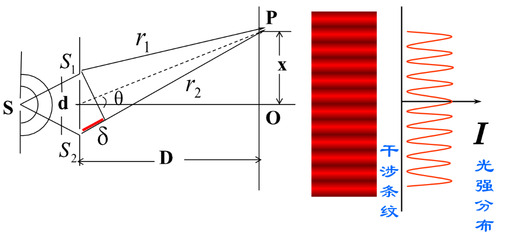 杨氏双缝干涉实验(图1),利用同一光源S通过两个狭缝S1和S2得到的两束相干光束。由于两条狭缝到光源距离相同,所以,两束相干光束在同一波面,相位差为0,并且光强相等。