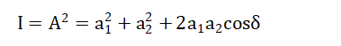 这里,我们用a1和a2分别代表P点处两束光的振幅大小。此处利用代数相加法计算光强有