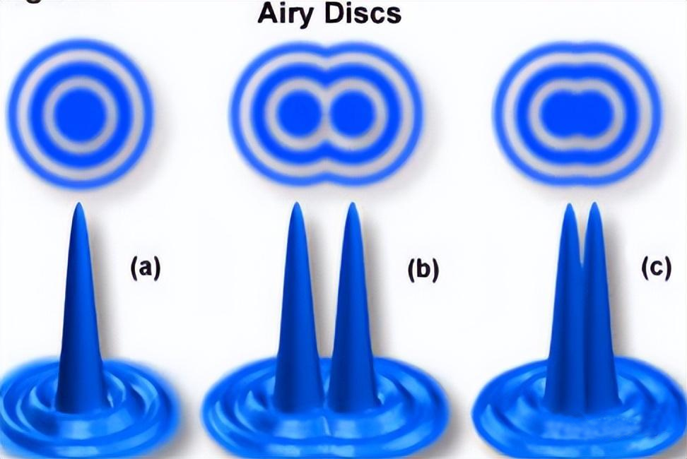 当两个接近的点成像后就会如图5所示,两个衍射圆会有部分重叠在一起,如果距离更加接近,光强分界线变得模糊,不明显,使得我们无法分辨两个点,此时两个点之间的距离有了一个定义,当两个点逐渐接近,使得我们能恰好分辨两个点的距离,称为分辨率。这也是衍射对几何光学最主要的影响。为了更好统一恰好分辨这个概念,一般在光学中利用瑞利判据,定义一个点物衍射图样的中央极大与近旁另一点物衍射图样的第一极小重合,作为光学成像系统的分辨极限,认为此时恰好可以分辨开两个点物。