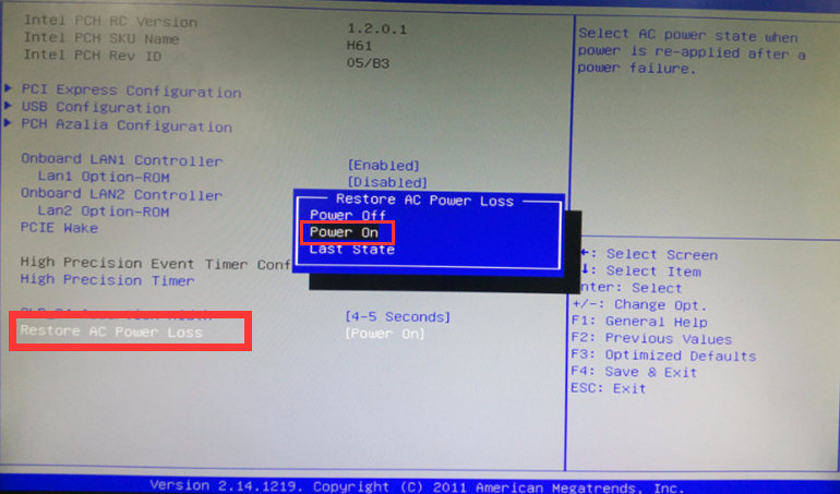 "选中Restore AC Power Loss"选项,设置为“Power On”,设置此选项的目的为电源开启后,杏耀平台登录入口视觉控制器自动启动。