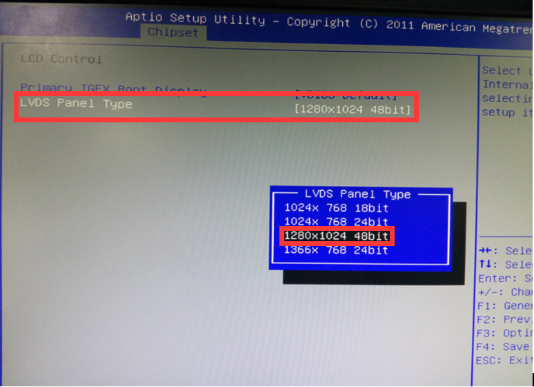 将"LVDS Panel Type"分辨率设定为1280x1024 48bit.