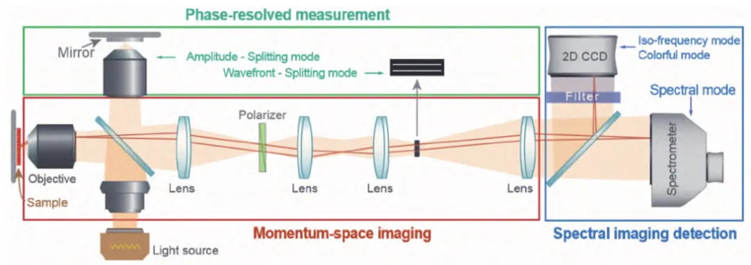 傅里叶平面成像利用光学透镜进行光学傅里叶变换来获得动量空间信息,而不是数值傅里叶变换,它不需要逐个位置扫描或角度扫描,并且适用于尺寸较微小的样品。例如动量空间成像光谱(MSIS)系统,该系统由动量空间成像模块、光谱成像探测模块和相位分辨测量模块三部分组成。其中动量空间成像模块和样品散射光接收光路中均使用傅里叶平面成像法,傅里叶平面成像法能够快速并同时获取各个角度的光谱,但该方法受到物镜数值孔径的限制。