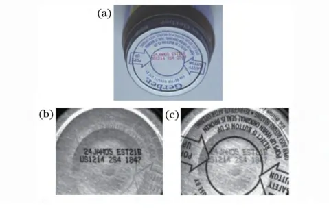图5 铝合金瓶盖红色与蓝色照明成像效果 (a)待测瓶盖 (b)红色光照明结果 (c)蓝色光照明结果