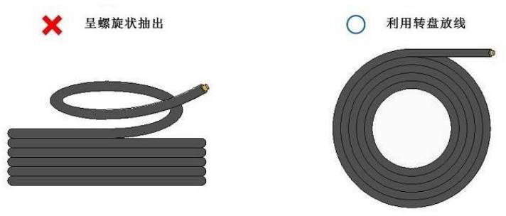 取出拖链电缆时,一定不能扭曲。不可以从电缆卷筒或电缆盘的某一端解开电缆,应该先旋转卷筒或电缆盘将电缆展开,不用时可以将电缆展开或者悬挂起来。