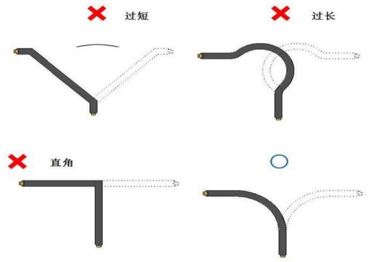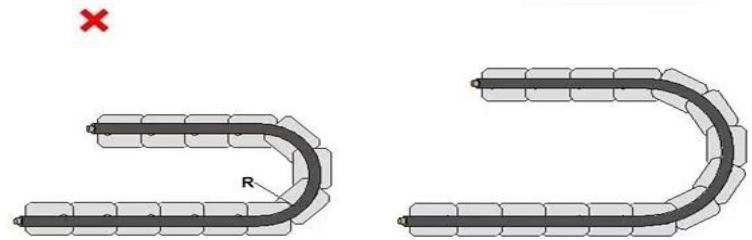 如果拖链电缆在布线时受到张力拉伸会导致拖链内壁产生摩擦从而发生护套磨损;布线时过于松散,也会导致拖链内壁产生摩擦从而发生护套磨损和拖链里面的电缆产生缠绕。正确的布线应该是长度正好可以通过拖链的中心线。