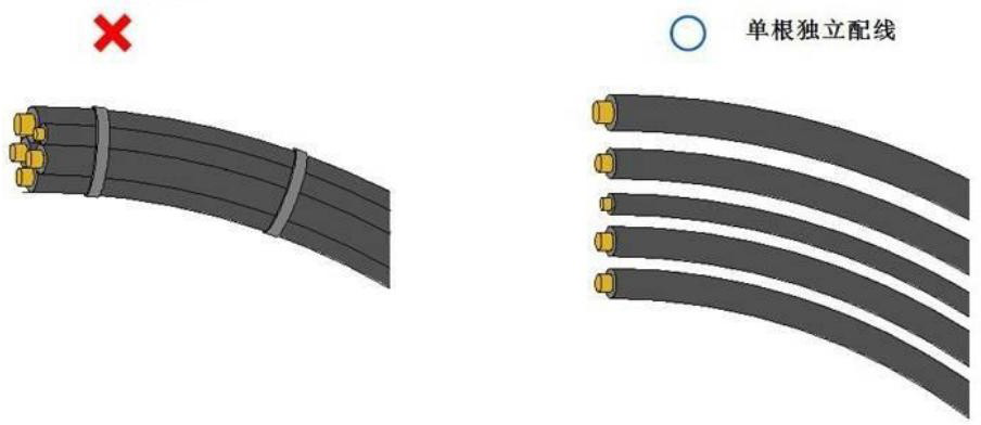 选择能够保证电缆间距的拖链,在拖链内实施水平布线时电缆间的空隙至少应为电缆直径的 10%,这样在布线的同时才能防止拖链电缆之间的相互干扰。